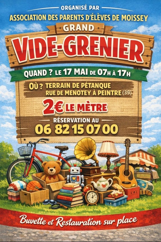 Vide grenier organisé par l’APE de Moissey le 17 mai de 7h à 17h à Peintre
