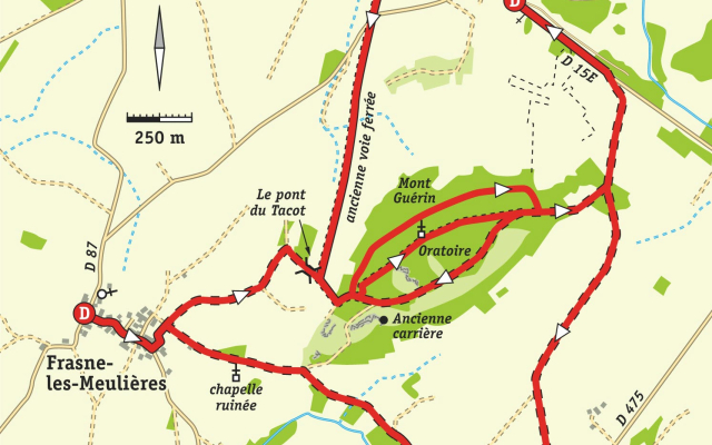 Vous montez vers l’église par les escaliers face au café. Descendez à gauche pour traverser la place de la Mairie puis, au carrefour (Dieu de Pitié sur la droite), traversez la D 475. Prenez en face la rue Basse et continuez tout droit pour monter vers Frasne-les-Meulières. Après les ruines d’une chapelle, à l’entrée du village, empruntez un chemin à droite pour rejoindre le pont du Tacot.